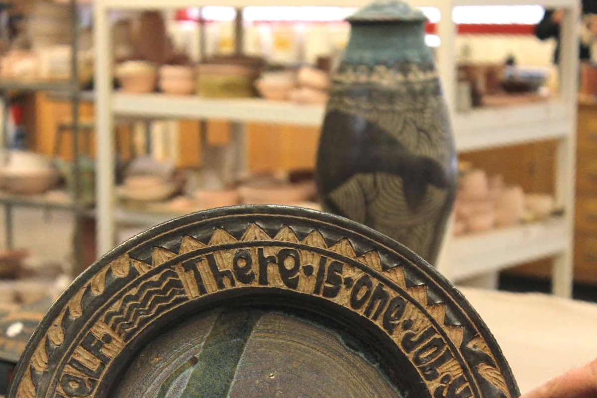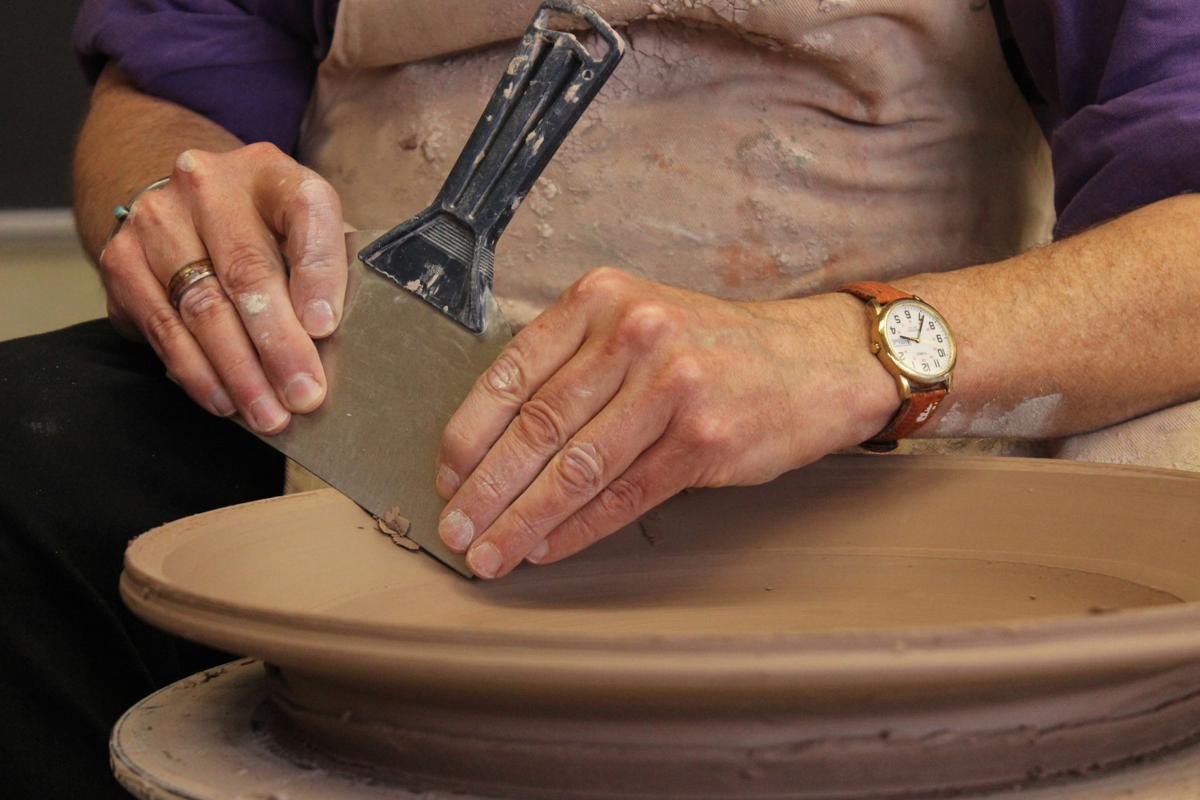 Gripping a painter’s wedge with both hands, Bishop held the blade steady along the lip of the plate. Brown petals of clay curled out from behind the wedge where the lip met the blade. Minutes later, it was finished.