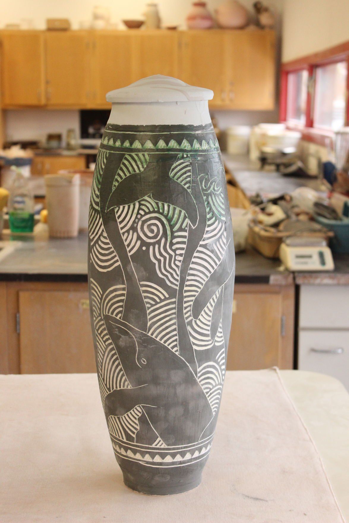 But while many of the images depicted in Hopi and Zuni ceramics tell creation stories, the animals Bishop carves into his pieces are part of a story of destruction. The sea turtles, humpback whales and other animals he chooses to depict are in danger of going extinct. Of the seven species of sea turtles that exist, nearly all are endangered and three are critically endangered, according to the World Wildlife Foundation.