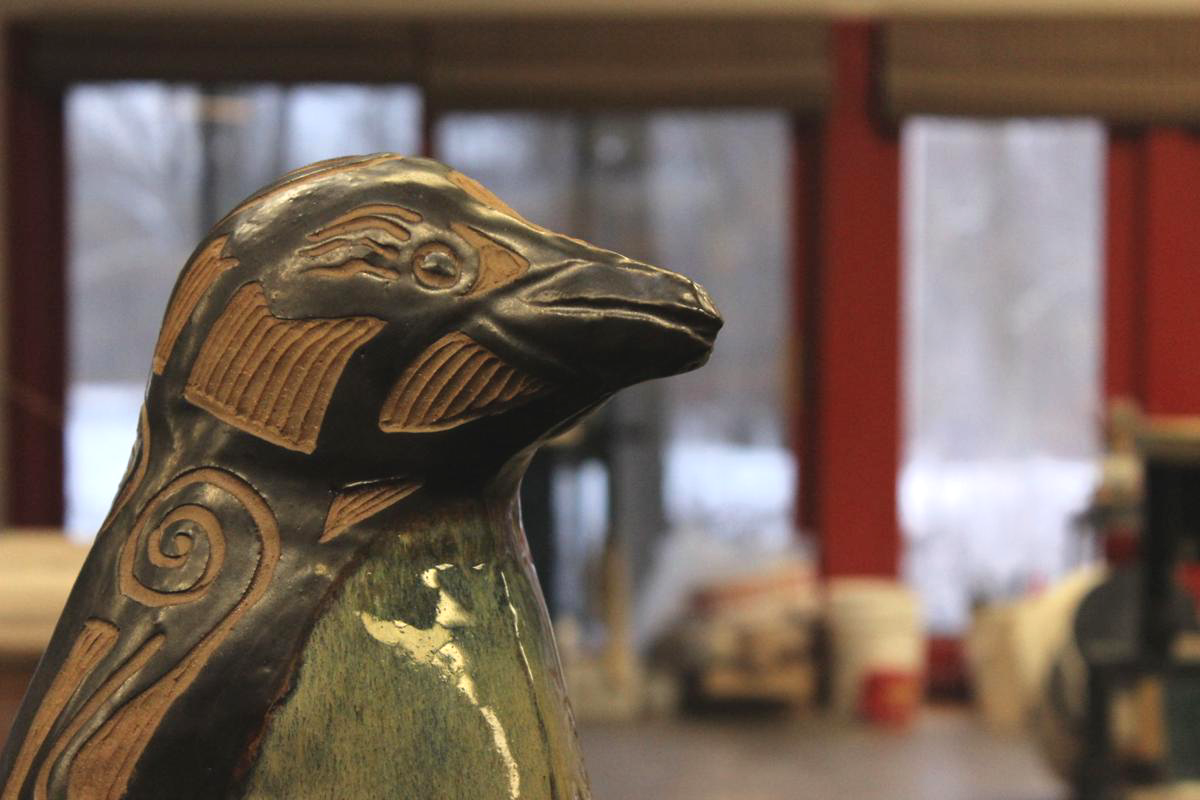 One of Bishop’s most striking pieces is a life-sized likeness of an Adélie penguin. It stands 14 inches tall, glazed glossy black, and its coat is embossed with swirls and stripes.